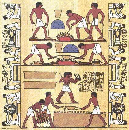 上段:足踏ふいごで風を送りるつぼの中の銅をとかす 中段:とけた銅の入?たるつぼを炉からとりだす 下段:扉の鋳型に銅を鋳こむ 紀元前1500年ころのテーペの 墳墓(ふんぼ)から出土したパピルスに書かれた絵をもとに書いたものです。 (H.Wubbenhorst 「5000 Jahre GieBen voa Metallen」より) 鋳物の文化史 石野 亨 小峰書店 1995年