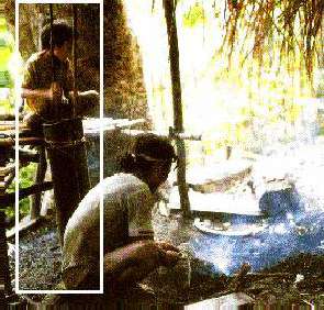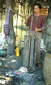 しかし、口で吹くのはしれたもので、徐々に改良されてゆきます。水鉄砲のように、 又、 2本の管を組み合わせた写真のような形に、 2本の筒を組合せ効率を上げたものが現在でも使われている 地域があります。東南アジアの一部、 ミヤンマーやフイリピンなど。 この鍛冶風景は、フイリピインの少数民族、ミンドロ島に住むマンヤン族の鍛刀風景です。 父親が刀を鍛える横で子供がふいごを操作をしています。 ふいごは往復ともに風を送れる構造を持って います。それは日本の差し吹きふいごと共通です。 |