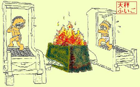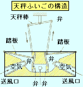 大勢の番子が交代し、『けら』が生まれるまで踏み続けます。江戸時代末期(1691年)に 出雲地方で天秤ふいごが発明されます。このふいごでは、従来の踏みふいごとは異なり、 左右各1〜2名で作業が出来るようになりました。ちなみに、踏みふいごでは左右3〜4人が 同時に作業しました。 この発明で、大幅な省力化が図れ、又、送風量が大量になり安定したことにより、鉄の生産量は 飛躍的に向上しました。発明された、出雲を含む中国地方のたたら場で特徴的に発達しました。 順番を決めて交代することを『かわりばんこ』と言いますが、この言葉は番子が交代しながら 作業していたことに由来します。また、『たたら』と言う言葉は踏みふいごを意味した言葉が 製鉄全体を表す言葉になって行きました。 |