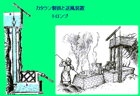 一風かわった送風装置、それがトロンプです。フランスとスペインの国境付近のピレネー山脈 の南麓の地域に発達した製鉄法--カタラン製鉄--はヨーロッパ各地およびインドやアメリカにも 波及しました。